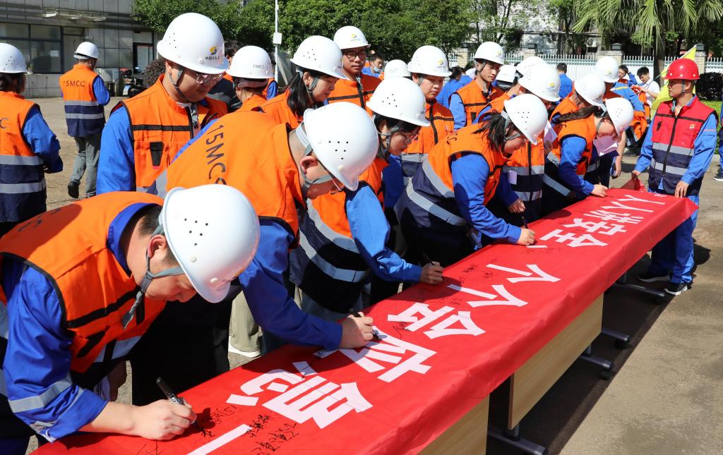 中色十五冶青年員工在“安全生產(chǎn)月”啟動儀式橫幅上進(jìn)行簽名